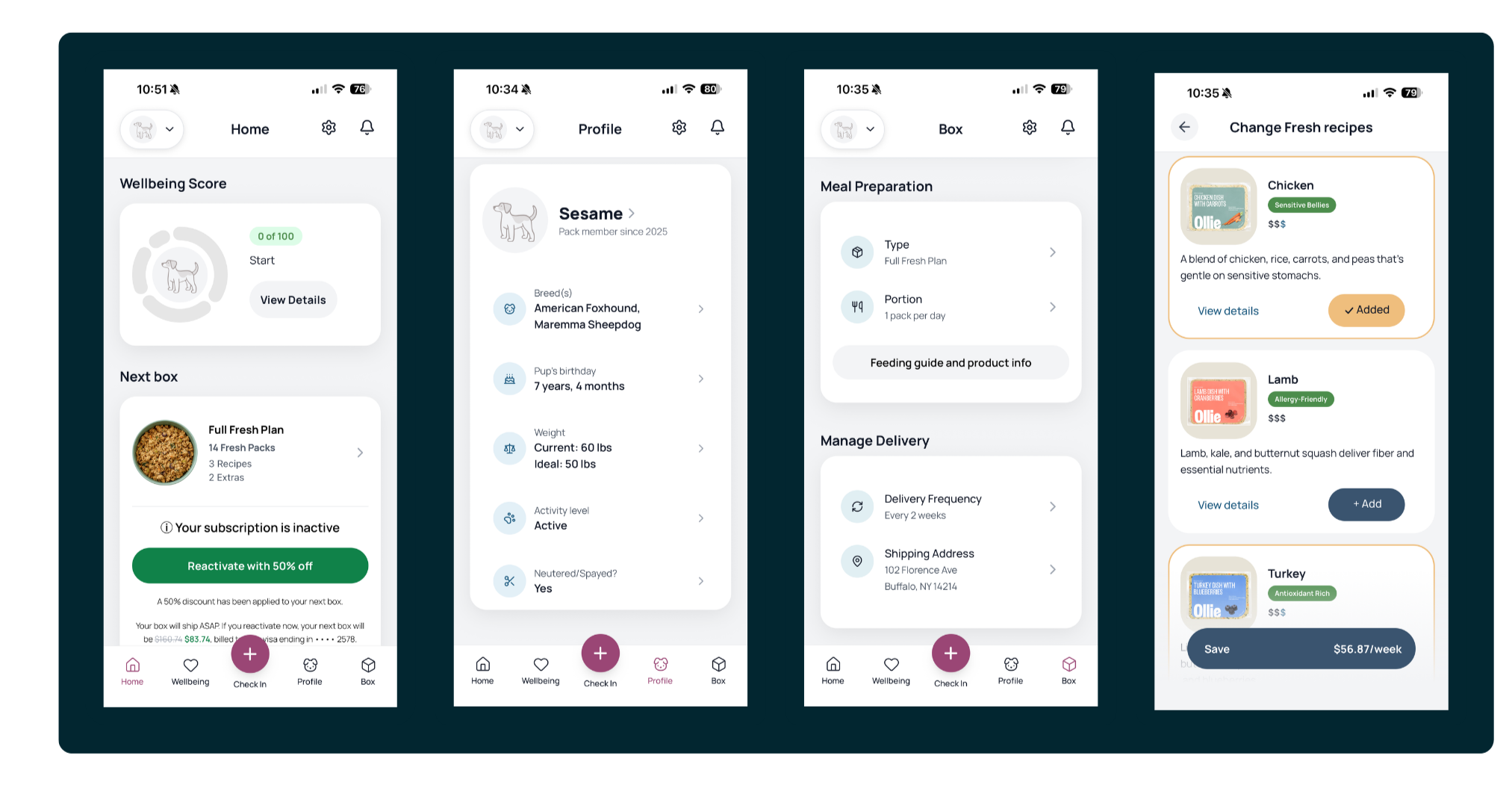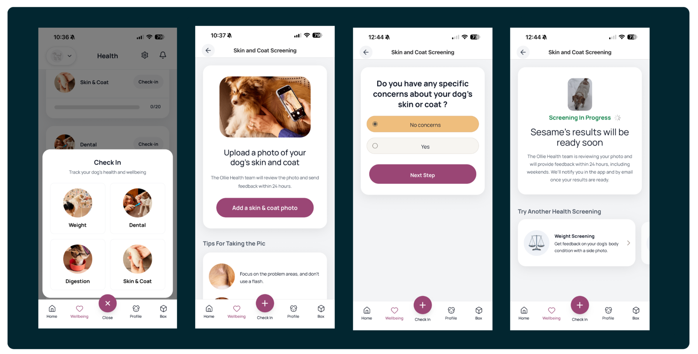 Ollie launched Health Screenings to help members monitor key areas of their dogs’ health and receive actionable advice from in-house veterinarians. This app-exclusive service went through dozens of iterations, required ongoing user research and testing. Copy needed to strike a delicate balance between authoritative and empathetic, all while maintaining a straightforward, clean UI.